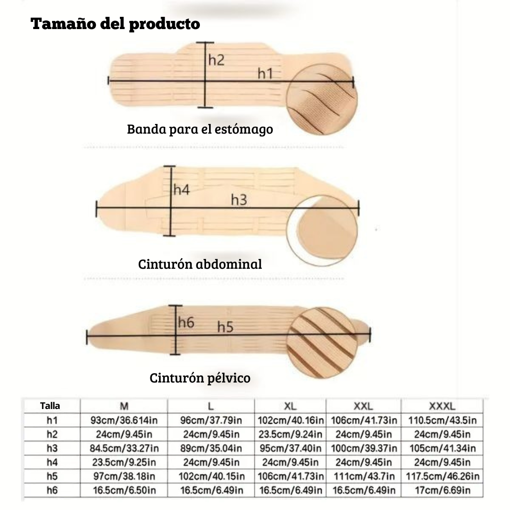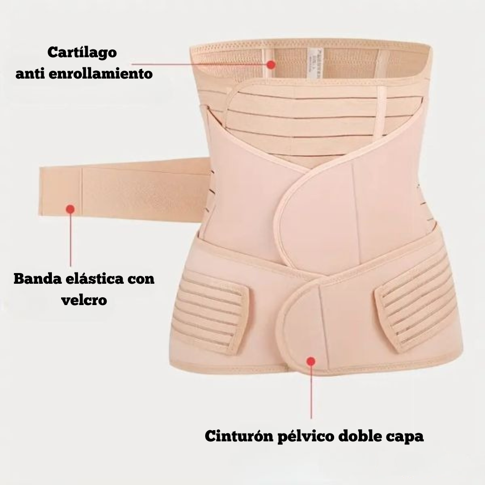 Incluye tres bandas especializadas — banda para el estómago, cinturón abdominal y cinturón pélvico, que trabajan juntas para brindar compresión equilibrada y soporte completo durante el postparto.